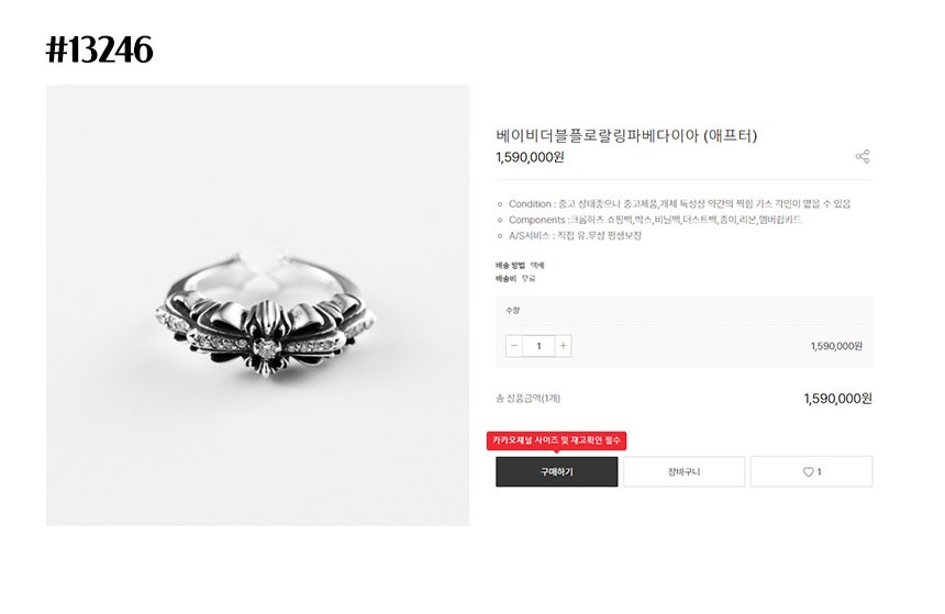 🔲 고퀄 프리미엄 라인 🔲🔘 컬러 : 실버🔘 사이즈 : 남여공용 FREE SIZE / 지름 : 2cm (미세오차허용)🔘 구성품 : 본품, 더스트, 쇼핑백, 게런티카드 등등 풀박스구성