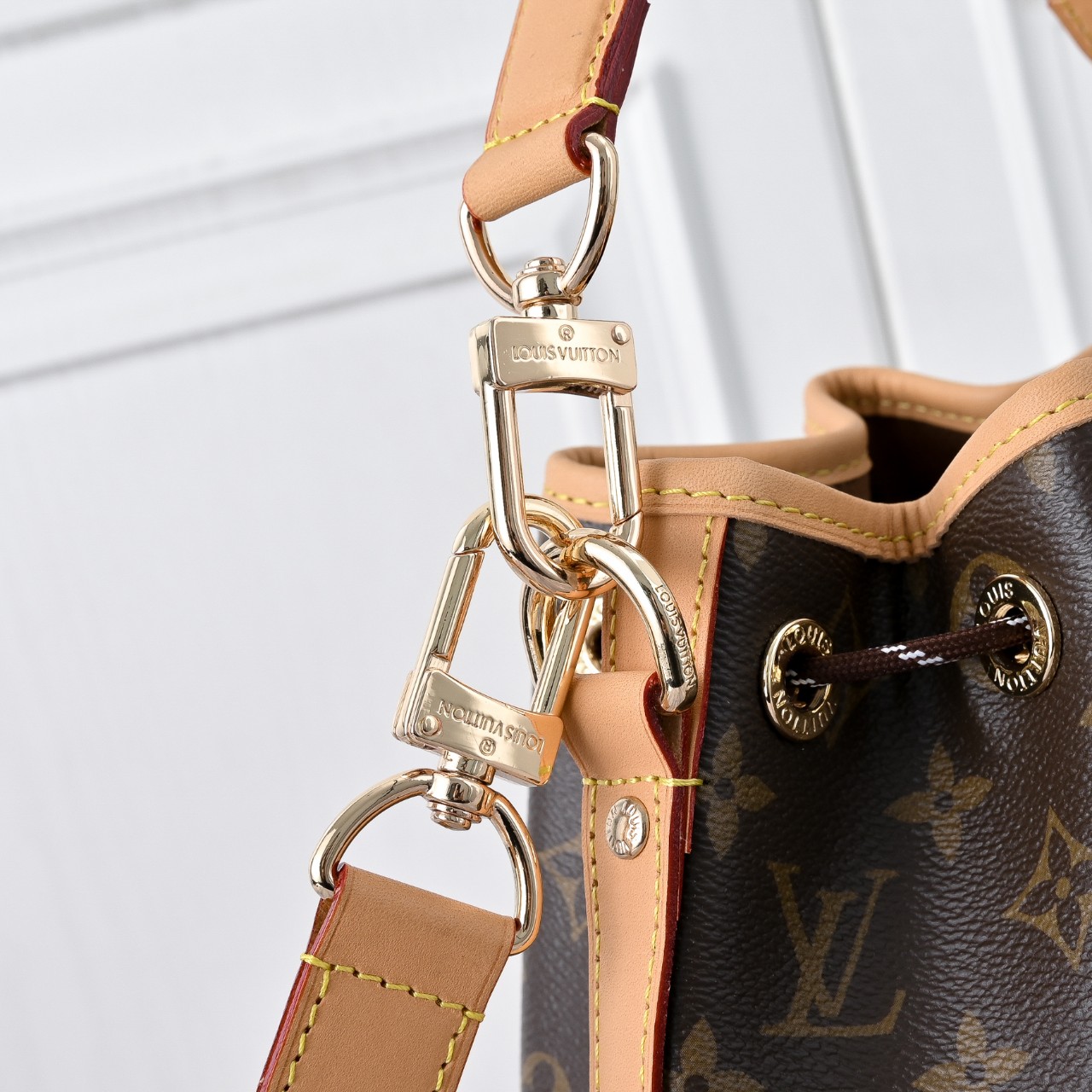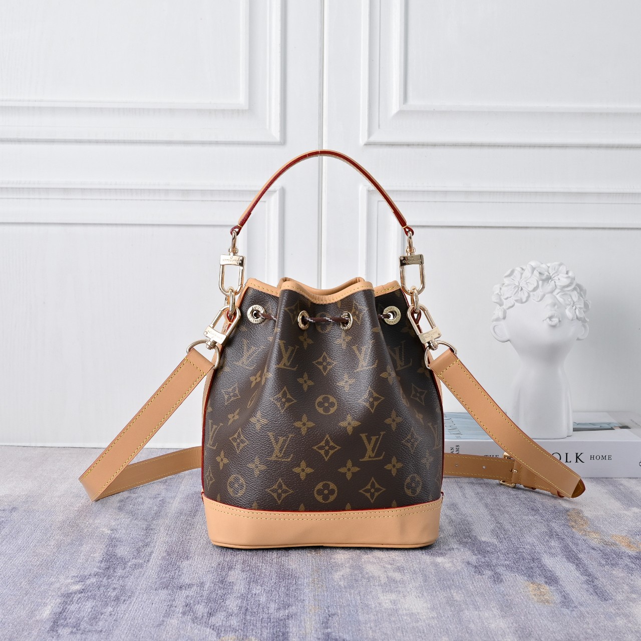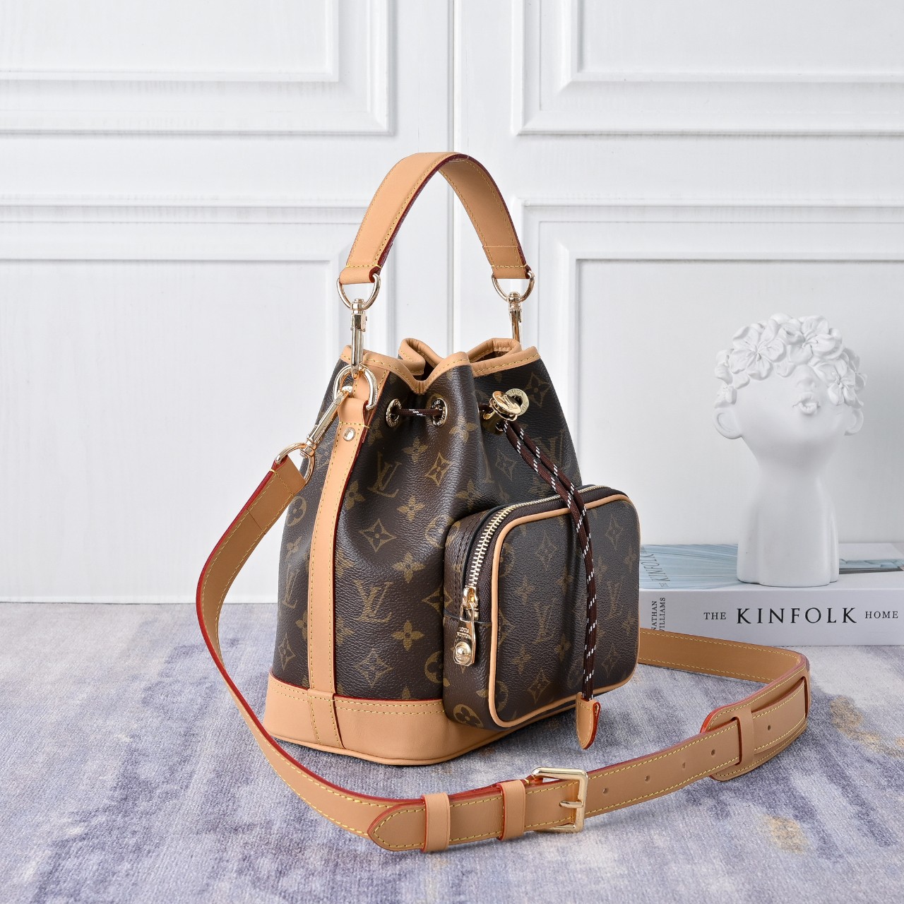 에이지드 가죽 소재의 트리밍을 더한 모노그램 캔버스 소재로 선보이는 노에 카고. 1932년에 샴페인 병을 운반하기 위해 만들어진 최초의 루이 비통 노에 버킷 백의 핵심 요소를 모두 담아낸 디자인. 넉넉한 앞면 포켓과 정교한 디테일이 현대적인 감성을 전하는 동시에 하우스의 유서 깊은 역사에 오마주를 바치는 아이템. 다양하게 연출할 수 있는 탈착형 상단 핸들과 숄더 스트랩.