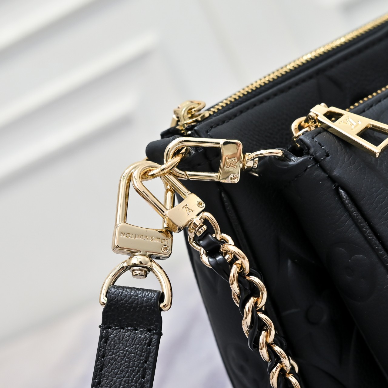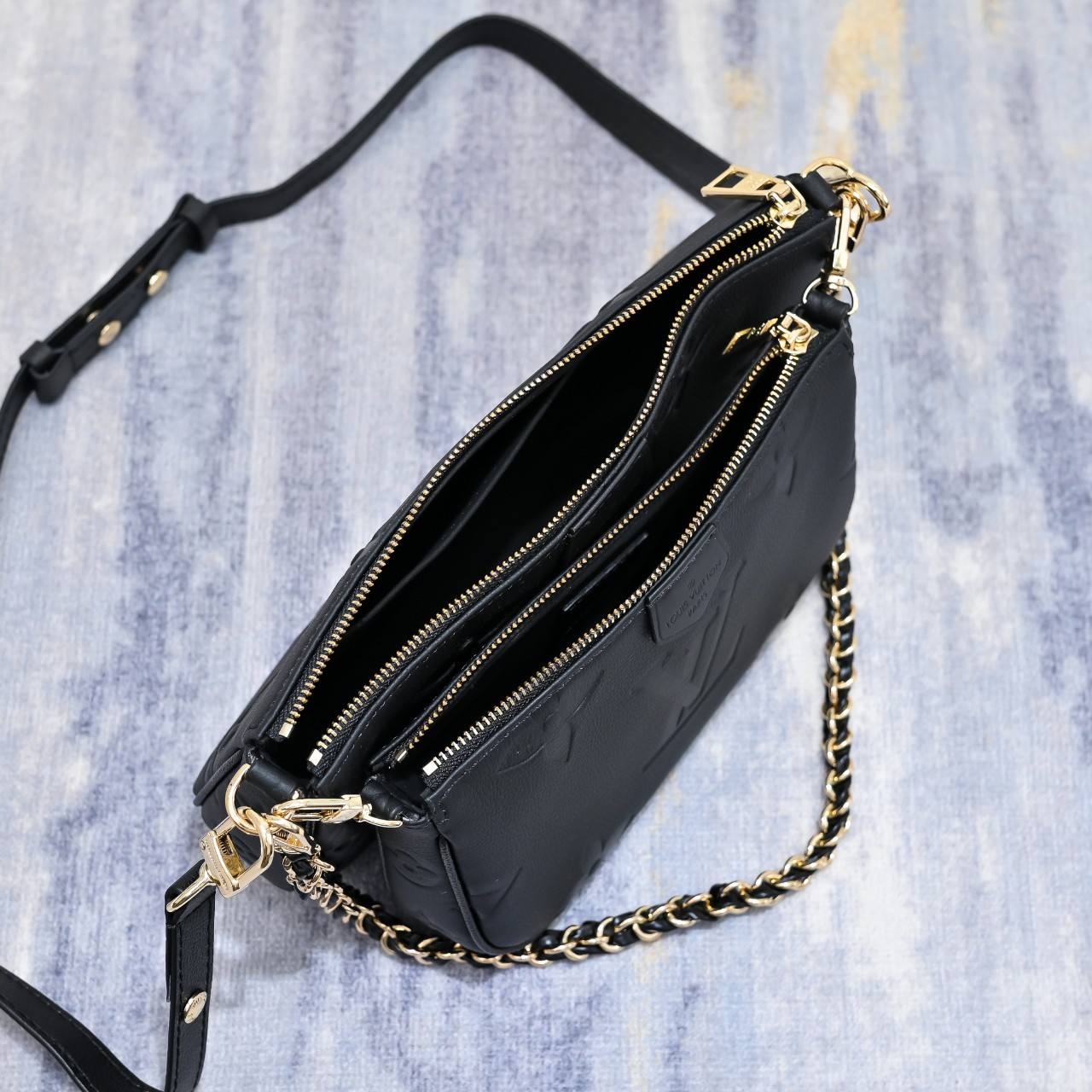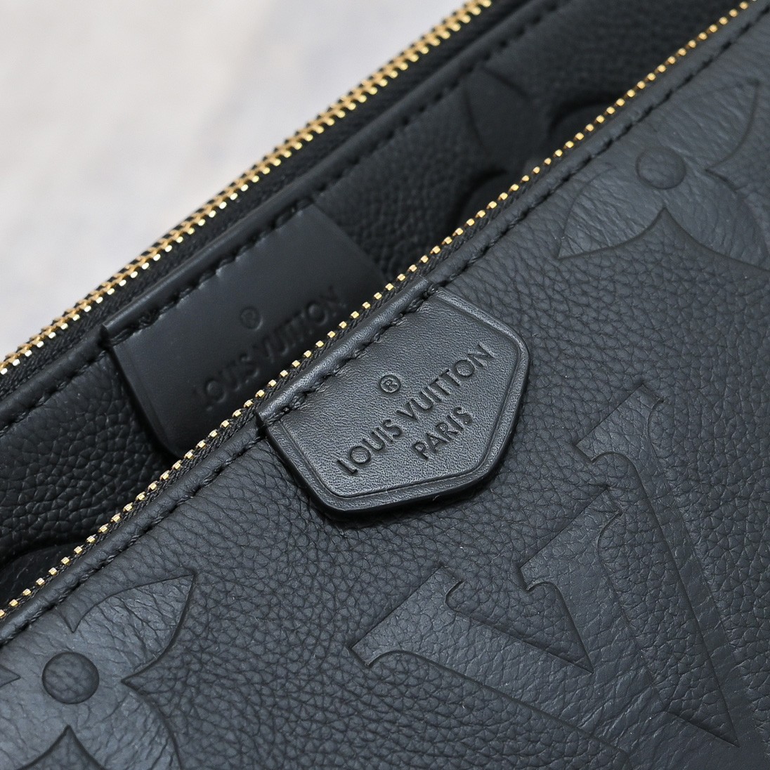 디자인과 기능성의 조화가 돋보이는 모노그램 앙프렝뜨 가죽 소재의 멀티 포쉐트 악세수아(Multi Pochette Accessoires) 크로스 바디 백. 두 개의 파우치, 골드 색상의 체인, 가죽 스트랩 등 모든 요소가 탈착 가능한 투인원 시스템. 앞면의 양각 오버사이즈 모노그램과 옆면 거싯 부분의 클래식한 모노그램 패턴이 완벽한 대비를 이루는 디자인.