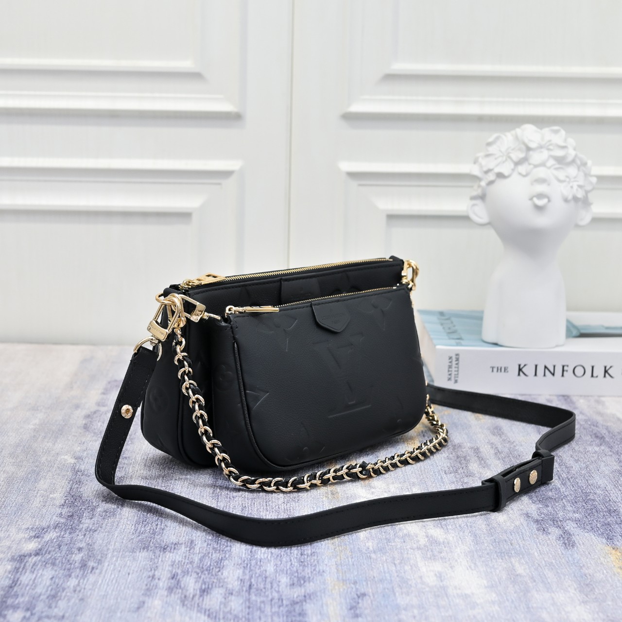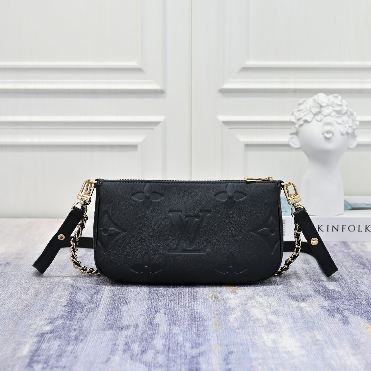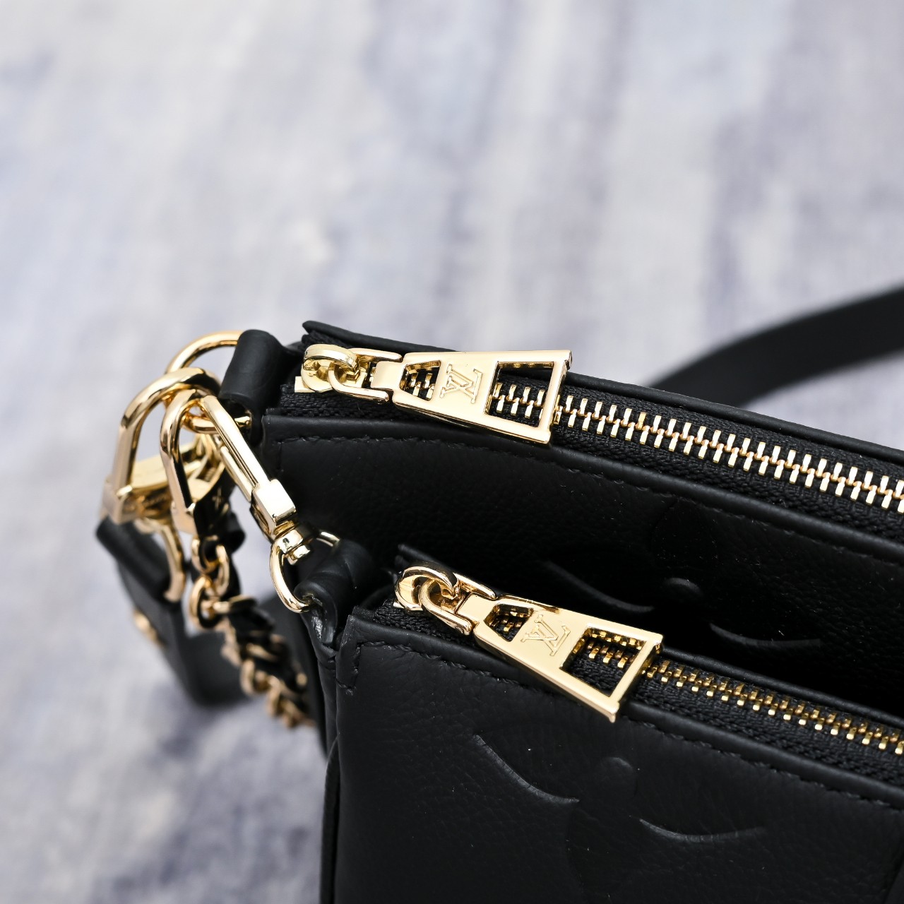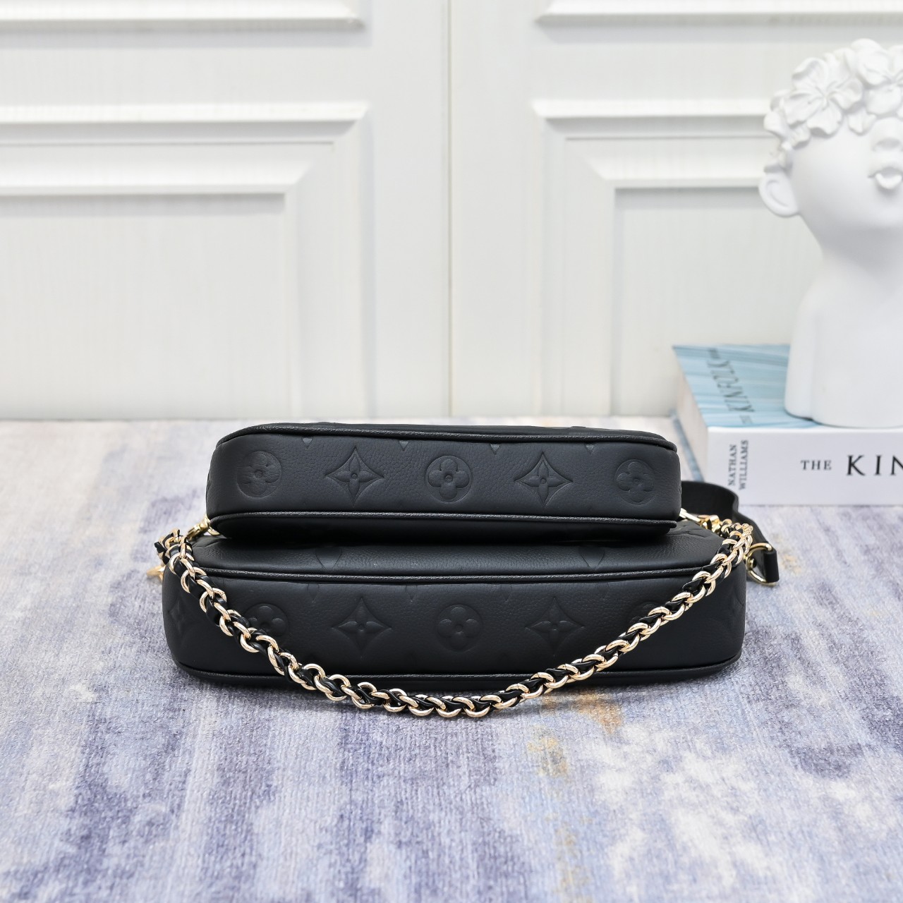 디자인과 기능성의 조화가 돋보이는 모노그램 앙프렝뜨 가죽 소재의 멀티 포쉐트 악세수아(Multi Pochette Accessoires) 크로스 바디 백. 두 개의 파우치, 골드 색상의 체인, 가죽 스트랩 등 모든 요소가 탈착 가능한 투인원 시스템. 앞면의 양각 오버사이즈 모노그램과 옆면 거싯 부분의 클래식한 모노그램 패턴이 완벽한 대비를 이루는 디자인.
