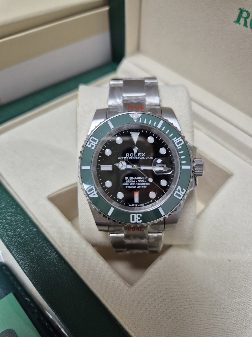 다이얼 초침 까지 완벽하게 구현된 상품입니다메탈 워치 이지만 시계 줄 따로 줄일필요없이바로 조절 가능합니다 (신버젼)국내 유통 상품중 최고급 확실합니다저급과는 무게감부터 달라요^^구성품까지 완벽해 선물용으로도 강추드립니다만족도 보장100% 보정없는실사국내 유통되는 저급상품과 비교불가◇ 구 성 : 풀박스◇ 컬 러 : 그린◇ 소 재 : 고강도스틸◇ 사이즈 : 41mm◇ 사 양 : 오토메틱