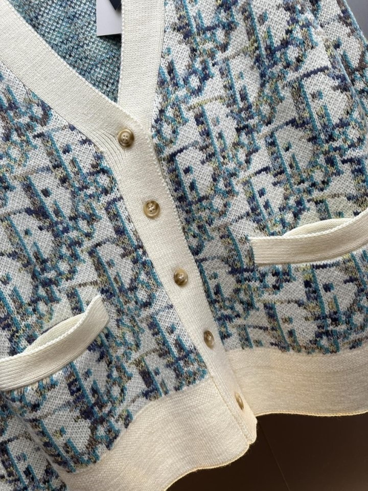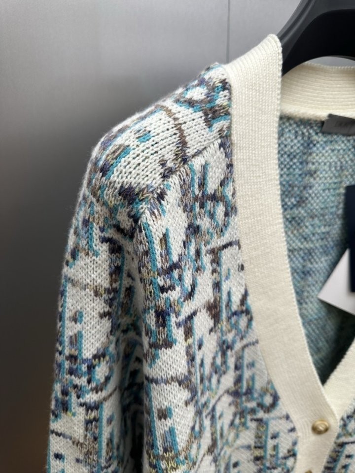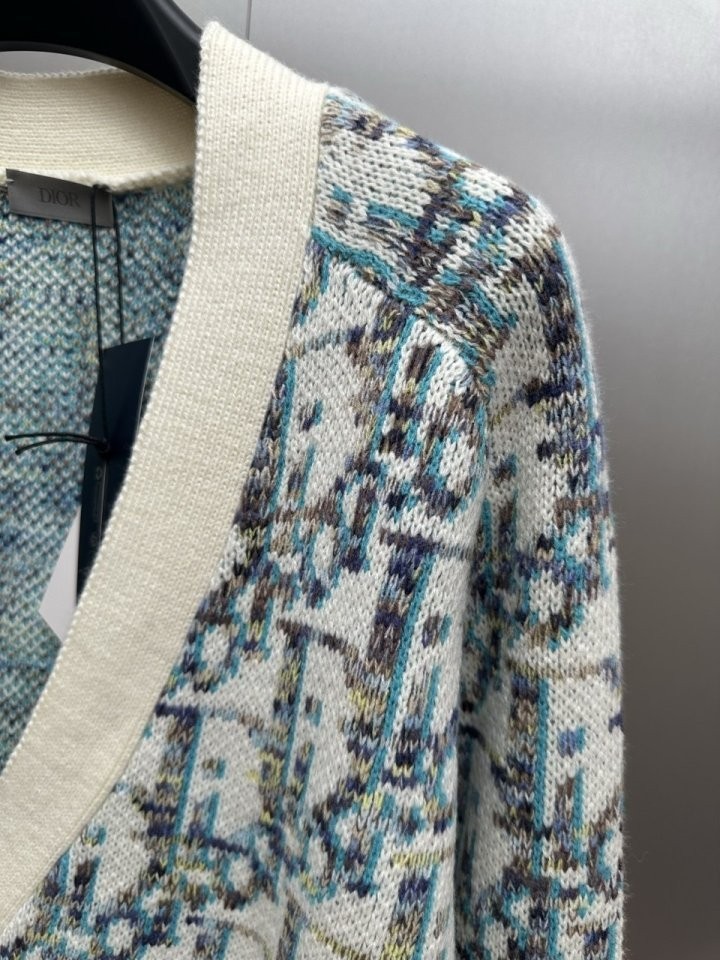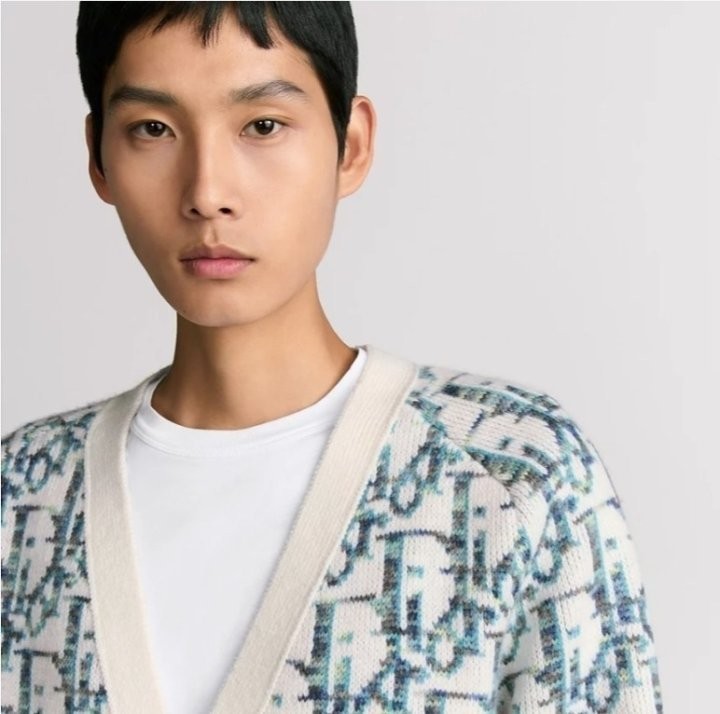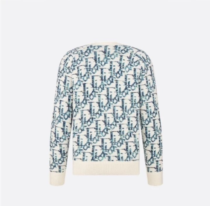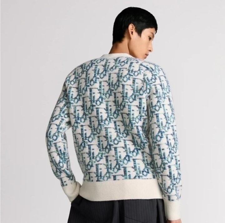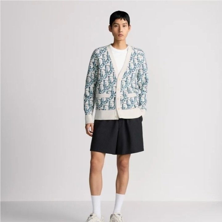 디올 하우스의 홀마크 Dior Oblique 모티브를 새롭게 해석한 니트 가디건입니다. 화이트와 블루 컬러가 어우러진 버진 울 자카드 소재의 캐주얼한 실루엣으로 버튼 클로저와 리브드 디테일이 디자인을 완성합니다. 다양한 룩에 매치해 그래픽적인 무드를 더할 수 있습니다.