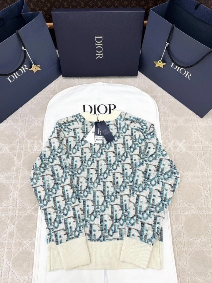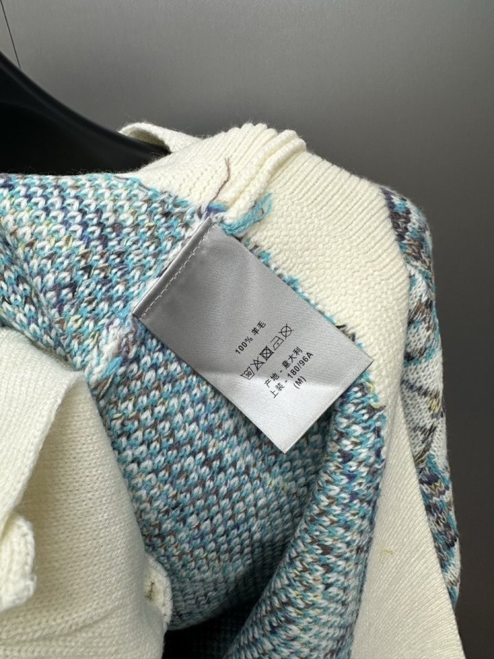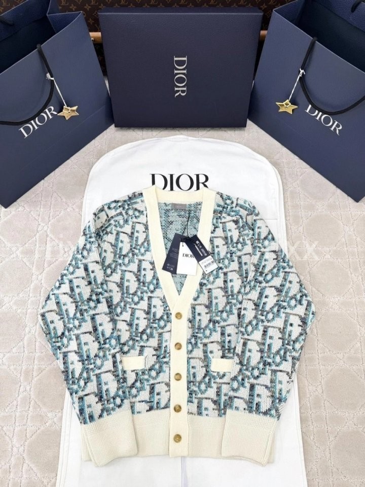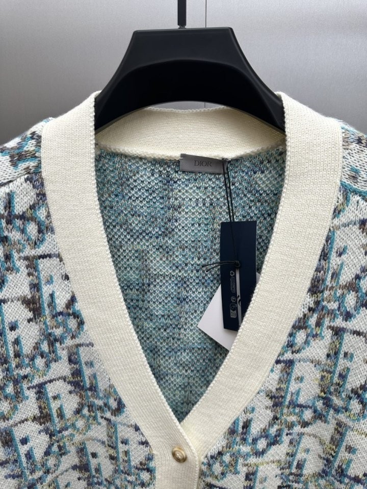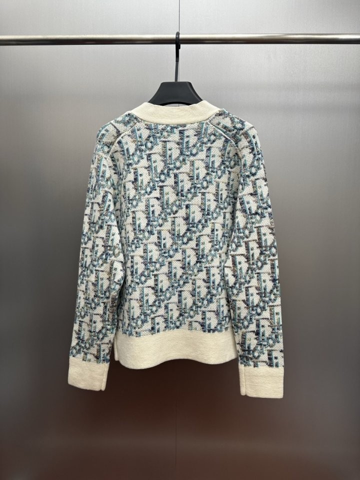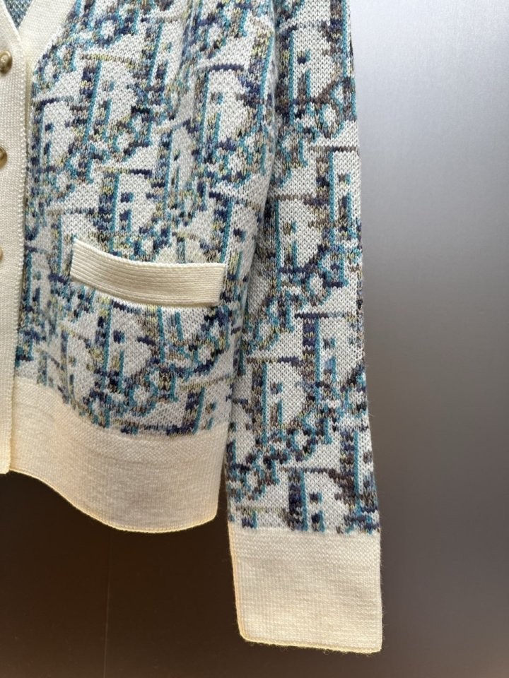 디올 하우스의 홀마크 Dior Oblique 모티브를 새롭게 해석한 니트 가디건입니다. 화이트와 블루 컬러가 어우러진 버진 울 자카드 소재의 캐주얼한 실루엣으로 버튼 클로저와 리브드 디테일이 디자인을 완성합니다. 다양한 룩에 매치해 그래픽적인 무드를 더할 수 있습니다.