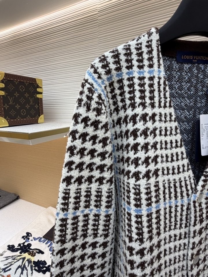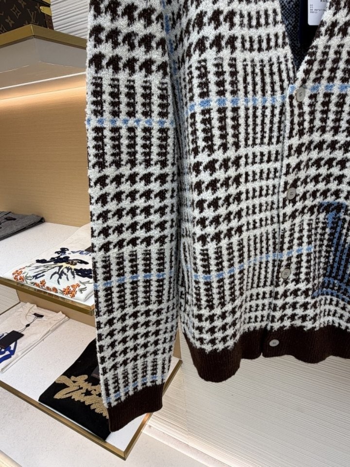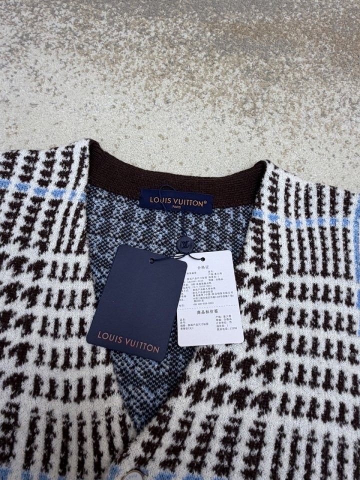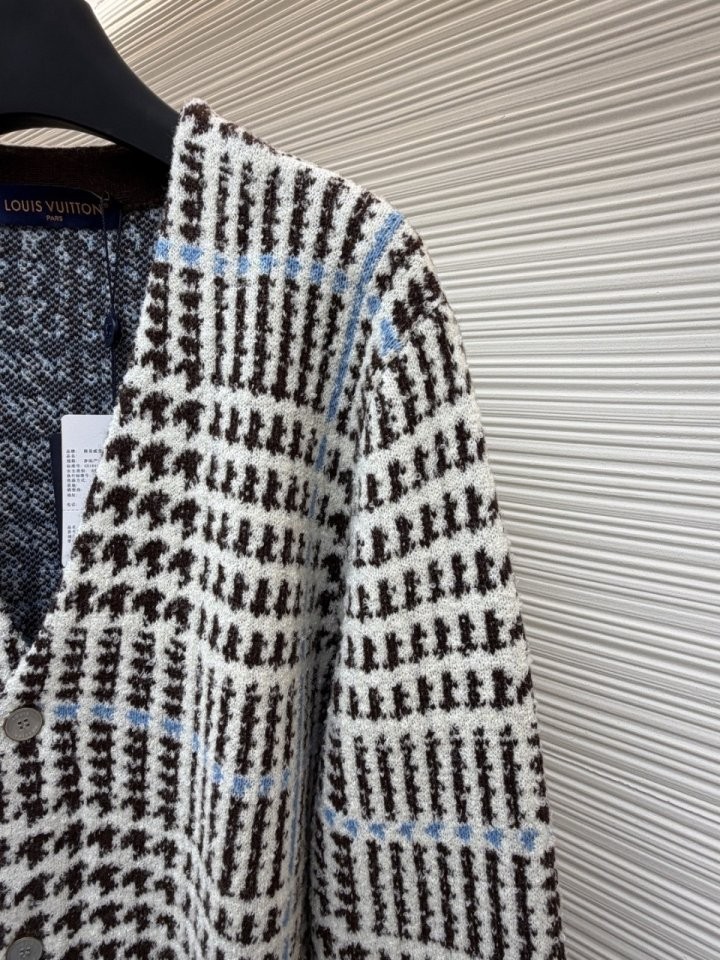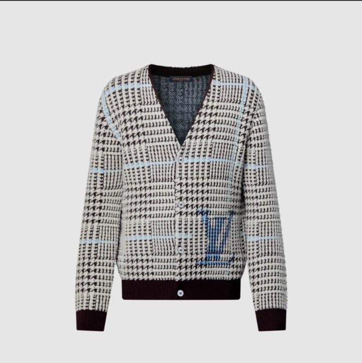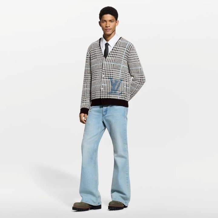 트렌디한 V넥 가디건은 전통적인 영국 테일러링 모티프를 그래픽 니트에 접목했습니다. 포근한 브러시드 울 소재에 크림색과 갈색의 초대형 LV 글렌 플레이드 자카드에 옅은 파란색 포인트가 더해졌습니다. 왼쪽 하단에는 커다란 파란색 인타르시아 LV 로고가, 어두운 색상의 골지 커프스와 허리선이 세련된 느낌을 더합니다