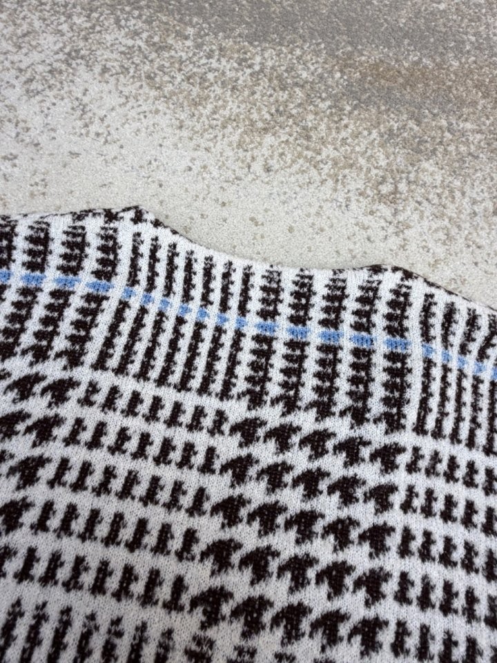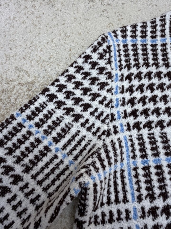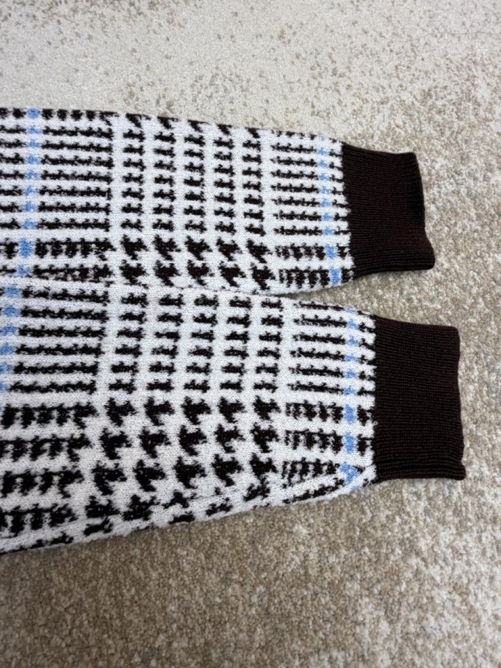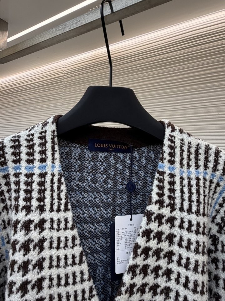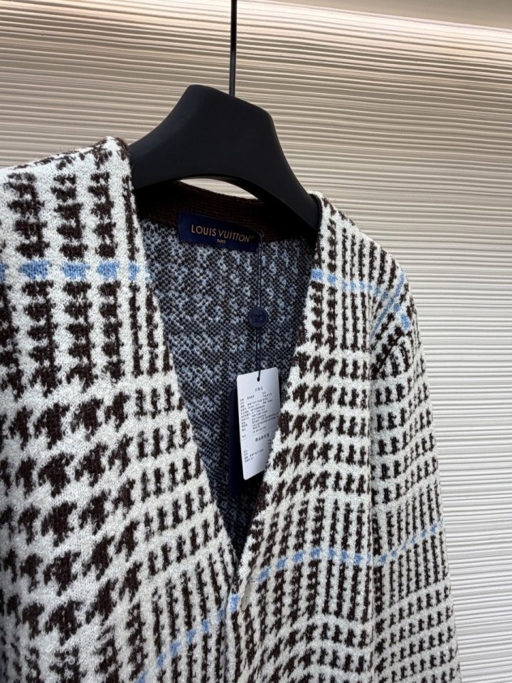 트렌디한 V넥 가디건은 전통적인 영국 테일러링 모티프를 그래픽 니트에 접목했습니다. 포근한 브러시드 울 소재에 크림색과 갈색의 초대형 LV 글렌 플레이드 자카드에 옅은 파란색 포인트가 더해졌습니다. 왼쪽 하단에는 커다란 파란색 인타르시아 LV 로고가, 어두운 색상의 골지 커프스와 허리선이 세련된 느낌을 더합니다