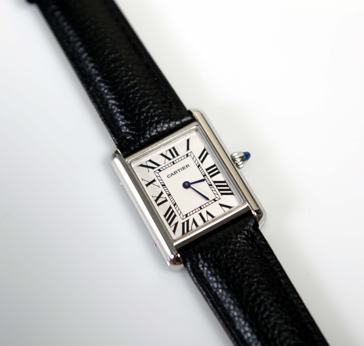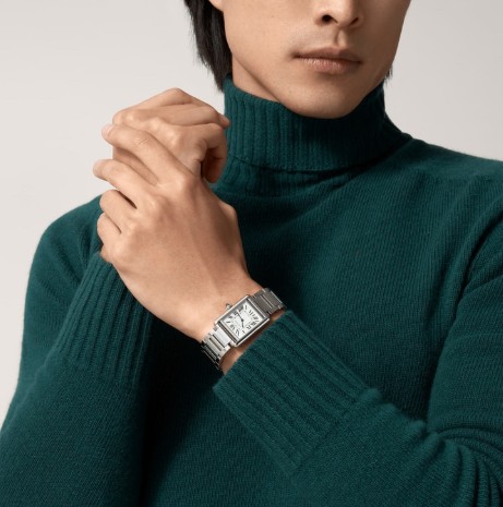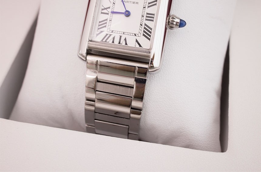 실버 마감 다이얼, 검 모양의 블루 스틸 핸즈, 스틸 브레이슬릿.