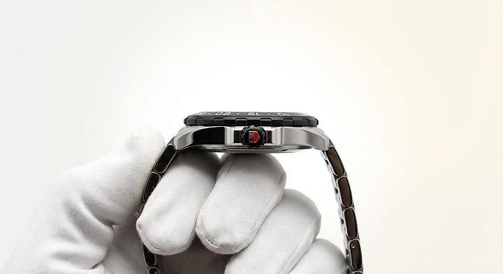 블랙 오팔린 다이얼과 조화를 이루는 크로노그래프 카운터 위로 밝은 레드 컬러의 중앙 핸드가 포인트 입니다.